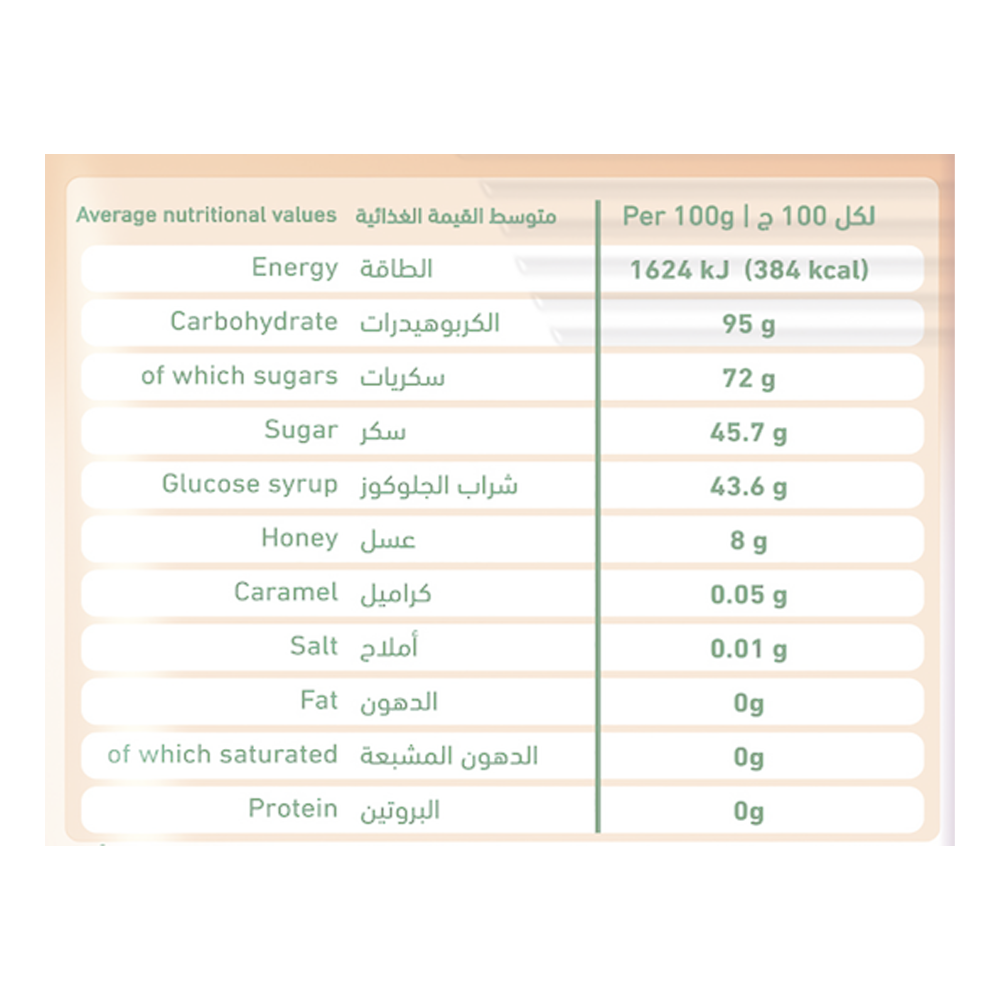 الحلق، ويجمع بين فعالية السكر و شراب الجلوكوز و العسل 8 % و الكراميل.