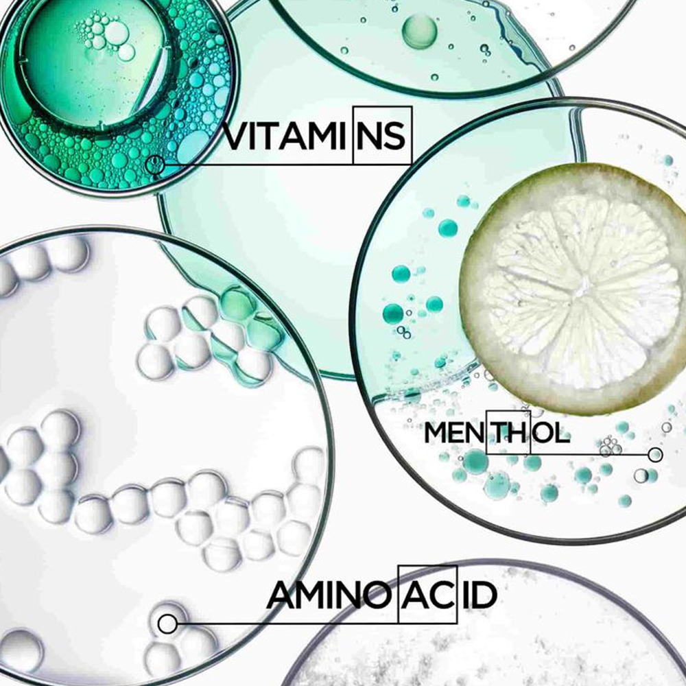 ماء، دينات الكحول، ليسات خميرة نبات ثنائي الشقوق، اسكوربيل جلوكوسيد، أمينوميثيل بروبانول، زيت الخروع المهدرج بولي ايثيلين غليكول-40، كربومير، مانوز، بولي سوربات 21، ألفا غلوكان سكريات قليلة التعدد، فينوكسي إيثانول، جليسرين، بنتيلين غليكول، عصارة جذور إجاص الأرض، خلاصة الخميرة، بنزوات الصوديوم، مالتوديكسترين، ليمونين، غيرانيول، هكسيل سينامال، بنزوات البنزيل، كحول البنزيل، لاكتوباسيلوس، لينالول، سيترال، عطر.