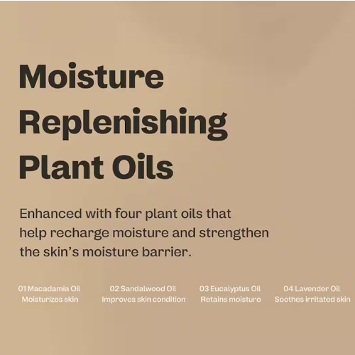 تركيبته الخفيفة تناسب البشرة المختلطة والجافة، بينما تساعد مزيج زيوت الماكاديميا، الصندل، الأوكالبتوس واللافندر على تنعيم البشرة وحمايتها من الجفاف.