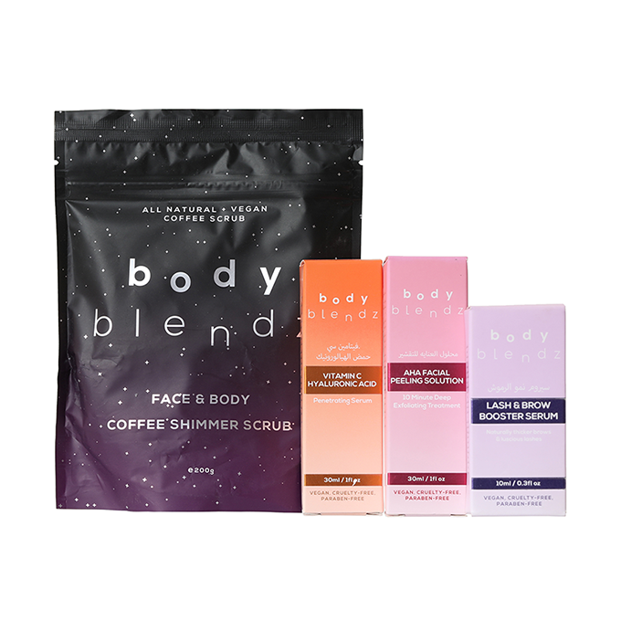 احصلي على مجموعة مثالية تضاف إلى روتينك اليومي لزيادة جمال بشرتك.تحتوي على مقشر الجسم والوجه بالقهوة الذي يقشر البشرة بلطف ويرطب بعمق.كما يمنع ظهور علامات التمدد ويقلل من حب الشباب بفضل مكوناته الطبيعية.من مكوناته الطبيعية الفحم والشاي الأخضر وفيتامين هـ وزيت جوز الهند.تحتوي على محلول تقشير الوجه الذي يعمل على تقشي البشرة وتجديدها وزيادة إشراقتها.تحتوي على سيروم فيتامين سي من بودي بلندز الغني بمضادات الأكسدة والمكون من مكونات طبيعية.تحتوي على سيروم نمو الرموش والحواجب غني بماء الورد والزيوت الطبيعية.يعمل سيروم الرموش على تعزيز نمو الرموش والحواجب وتكثيفها وتقليل تساقطها.