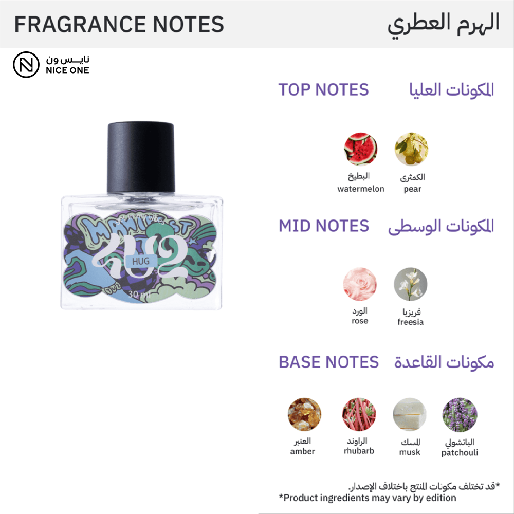 - محاط برائحة القاعدة المكونة من أوراق الباتشولي الإندونيسي والفانيليا والتونكا وخشب الصندل والجاوي والكاشميران واللابدانوم ونجيل الهند.
