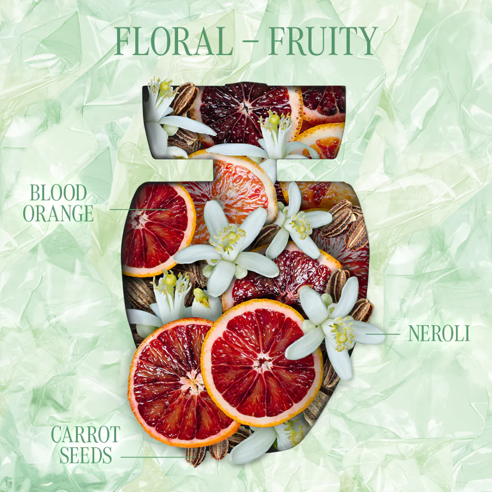 - المكونات الوسطى: البرتقال الدموي، زهر البرتقال، الشاي الأخضر، الجزر.