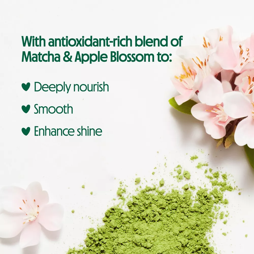 ماسك الزبدة مغذي للشعر شاي الماتشا الأخضر وزهرة التفاح البري هو علاج غني ومكثف مصمم لتغذية وترطيب شعرك بعمق.